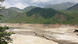 Le côté est du lac est celui où le lac est alimenté. Un ou plusieurs torrents, ruisseaux ou rus s’étalent lascivement sur une surface sablonneuse et plane, mise à nue par le niveau bas du lac.