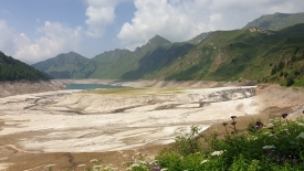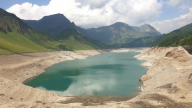 Et là, grosse déception : le lac est quasiment vide. Les berges s’avancent, grisâtres, sablonneuses ou rocailleuses, sur une cinquantaine de mètres. Des bruits de chantier remontent du fond.