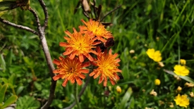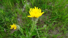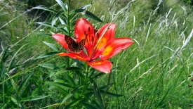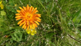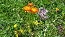 Près d’une petite chapelle, une baraque de chantier. Nous profitons de la pause Clif pour photographier quelques fleurs. D’abord des lis safranés, d’un bel orange, qu’on pourrait croire sortis tout droit d’un jardin botanique. Puis des paradisies, celles-là même que l’on trouve à La Dôle et seulement là dans le Jura.