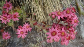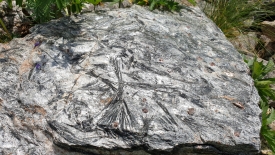 Chargés de 500 grammes de plus, nous quittons le sentier pour prendre de la hauteur. La pente est raide et la végétation dense. Comme nous sommes à l’aplomb d’une falaise, l’herbe est jonchée de pierres, à moitié cachées. En plus de ces pièges, il nous faut essayer d’écraser le moins de fleurs possible. Plus facile à dire qu’à faire, car ici, les fleurs sont abondantes. Parmi les pierres, certaines affichent des marques qui ressemble à des traces d’herbe fossilisée.