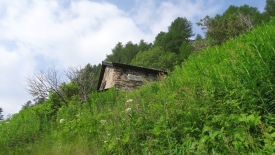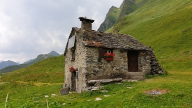 Une averse nous surprend. Enfin, pas trop, car depuis longtemps le soleil n’est plus et les nuages ont envahi le ciel et caché les cimes. Nous nous réfugions sous l’avant toit d’une bâtisse, à l’entrée de Cadagno di Fuori.