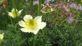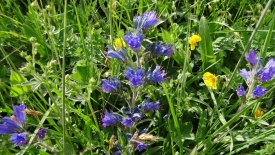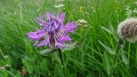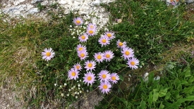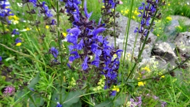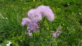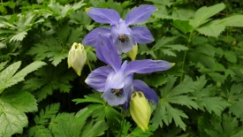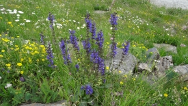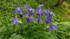 Au moment où nous longeons le bord ouest du lac, un sentier monte et je remarque, à proximité, une pente recouverte de bleu. Je les reconnais à la couleur : des ancolies des Alpes, par dizaine.