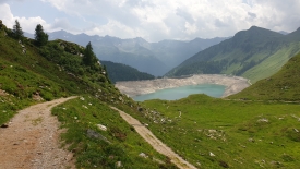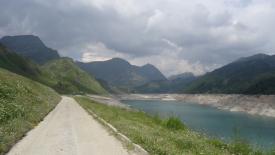 Nous descendons vers le lago Ritòm par une piste carrossable. En ligne droite, les deux ornières ont été revêtues de bloc de béton canelés tandis que les virages le sont entièrement. Nous arrivons ainsi sur la piste que fait le tour du lago Ritòm avec pour idée de compléter le tour commencé ce matin sur le sentier.
