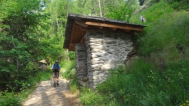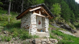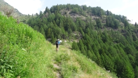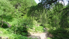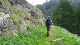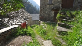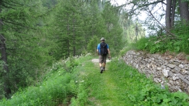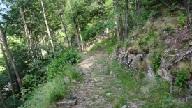 Le sentier longe une petite rivière, plutôt torrent d’ailleurs : la Foss. C’est elle qui s’échappe du lago Ritòm. Nous entendons parfois son rugissement furieux, lorsque la pente est trop inclinée et que l’eau ne coule plus mais tombe en cascade. De la terre fraichement retournée, des caniveaux de pierre récemment refaits laissent à penser que le sentier est régulièrement entretenu et sert peut-être encore à quelques paysans, réfractaires au progrès.