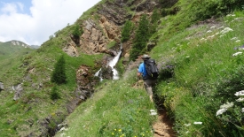 Nous l’apercevons un peu plus loin, à nouveau construit, se dirigeant vers la gorge où coule La Foss. Stefano me montre du doigt un passage particulièrement exposé et me dit en riant : je suis sûr qu’on va passer par là !