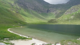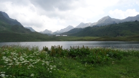 Près du chalet de l’Alpe Tom, le lac se termine par une jolie petite plage de sable. Dommage que le temps ne se prête pas à la baignade.