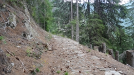 De sentier il n’a que le nom. En réalité c’est plutôt une piste étroite, pavée de pierres de dimensions différentes. Utilisée très certainement par le passé pour monter le bétail sur les pâturages.