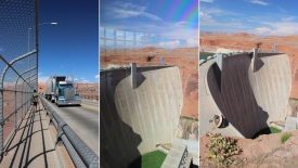 Nous continuons notre circuit par une traversée du pont à pied (1), précédée d’une halte au Visitor Center, histoire de profiter de la fraîcheur des salles climatisées. De là, une p’tite photo du barrage depuis l’intérieur (2), puis depuis l’extérieur (3).
