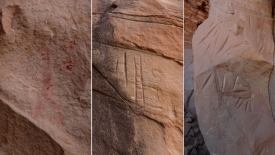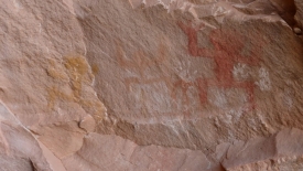 Nous admirons d’autres silhouettes rouges (1), une échelle dessinée et une forme humaine (2) et ces marques dans la pierre : peut-il s’agir d’un système de comptage ?