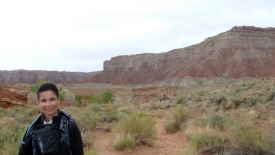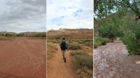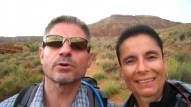 Arrivés au trail head, nous croisons des hikers qui rentrent… Plusieurs adultes et enfants qui nous disent avoir trouvé une grosse flaque d’eau de 4 pieds de profondeur qu’ils n’ont pu traverser… C’était sur le trail de Little Wild Horse Canyon… Nous optons donc pour la montée par Bell Canyon et la descente par Little Wild Horse Canyon… Nous verrons bien à ce moment là si la flaque est toujours là…. De plus nous avons nos water shoes, et nous ne craignons pas de nous mouiller les pieds.