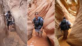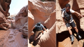 Ah Ah… De chaque côté, la paroi est lisse… Aucun moyen de passer sans marcher dans l’eau (1). Nous n’avons d’autre choix que de changer de chaussures et d’enfiler nos water shoes.