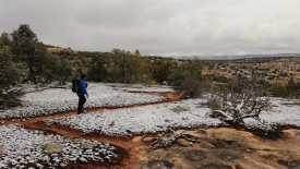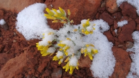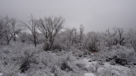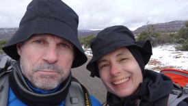 Hier, 29 mars, lendemain de mon anniversaire, nous nous sommes levés et il pleuvait. Zut ! Crap ! Merdouille ! Nous nous sommes recouchés dare dare, profitant pour faire une mini grasse matinée. Vers 9h, décidés, nous sommes partis en direction de Bluff, et plus précisément du Sand Island Petroglyph Panel. Car la pluie, selon la météo du jour, devait s’arrêter vers 10h. Nous avons refait une sieste dans la voiture, attendant en vain l’éclaircie. Puis l’envie d’un café nous a fait tenter le Twin Rocks Cafe et puisque les petits déj avaient l’air bon, nous nous sommes chacun régalés d’une bonne portion de oat meals. Assis près de la baie vitrée, nous avons regardé tomber la pluie qui ne semblait pas du tout avoir l’intention de s’arrêter. Résignés, nous avons repris la direction de Blanding, sous la neige cette fois et nous avons partagé notre après-midi entre la visite du musée Edge of the Cedars State Park (nous ADORONS ce musée) et la rédaction du premier billet de nos vacances. Juste avant d’aller au lit, Stefano confirme que demain aucune précipitation n’est prévue. Ouf, tout va bien !