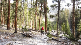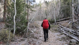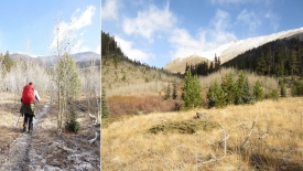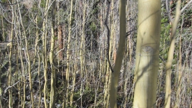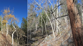 Nous traversons une mini-forêt d’aspens. Les sapins y deviennent largement minoritaires. À la taille des troncs, nous en déduisons que les arbres sont tout jeunes.
