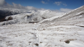 C’est facile, c’est tout droit et tout au fond de la vallée… Les taches blanches sur la photo sont des cristaux de neige soulevés par un vent furieux.