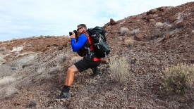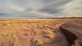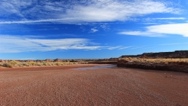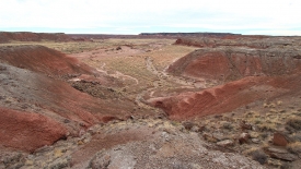 Nous retrouvons le Lithodentron Wash. Le Painted Desert Inn est bien visible, là-haut sur le rim, illuminé par le soleil.