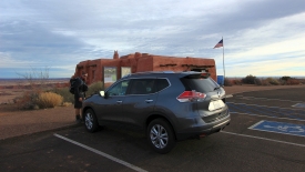 Voici d’où nous venons. Cette petite bosse, sur la mesa, tout au fond, est le Painted Desert Inn.
