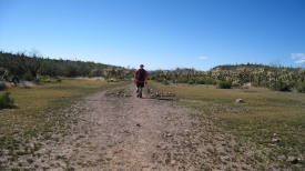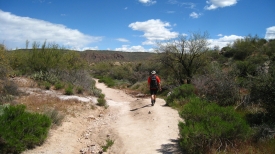 Envoi de notre message quotidien à la croisée des sentiers. Nous quittons le Dutchman’s Trail (#104), dont la première partie se nomme First Water Trail, pour emprunter le Black Mesa Trail (#241).
