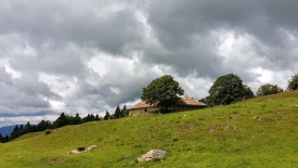 Aux Begnines, des aquarelles sont accrochées sur les murs extérieurs. Chic. Nous n’avions pas eu l’occasion de contempler ces œuvres l’année passée. L’une d’entre elles est vraiment jolie : elle représente la combe que nous avons sous nos yeux, avec de gros nuages sombres alternant avec des trous de ciel bleu.