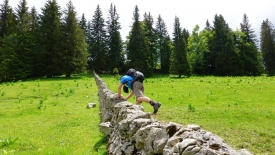 Pour passer d’un pâturage à l’autre, nous avons le choix entre une barrière au milieu d’une mare de boue et un passage approximatif au niveau du mur. Nous choisissons ce dernier, même s’il nous faut lever la jambe très très haut.