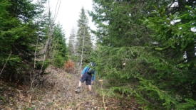 Notre prochain objectif est de retourner voir un chalet trouvé par hasard, en juillet, alors que l’orage nous poursuivait. Il est là, quelque part. Nous décidons de la rejoindre à la hussarde, en nous frayant un chemin dans la forêt.
