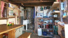 Nous ouvrons même la porte, qui n’a pas de serrure. La Cabane du Rocher est un refuge, ouvert à tous. Elle a tout ce qu’il faut pour se mettre à l’abri : un poêle, une batterie alimentée avec un panneau solaire, de l’eau (potable et non potable) et sans doute du thé et du café. Une petite alcôve, à l’extérieur, abrite du bois coupé, près à être mis dans le poêle. Au mur des photos. Par exemple des photos du courageux qui a monté le panneau solaire et la batterie. Un peu plus loin, une photo datée de 1930. À cette époque, la cabane s’appelait la Cabane des Éclaireurs. Nous ne touchons à rien et refermons soigneusement la porte.