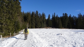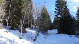 Nous coupons à travers champ pour rejoindre le sentier du Sapin à Siméon. Il est enneigé. La neige est dure et verglacée.