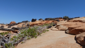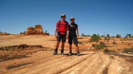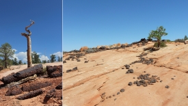 Des bout de lave (?), noirs ébènes, disséminés sur le slick rock.