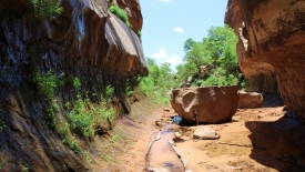 Nous marchons avec un groupe de 11 jeunes qui pratiquent le canyonisme (canyoneering comme disent les américains) et qui vont effectuer la descente du canyon. Ils sont équipés : casques, mousquetons, cordes, chaussures de wading (en tout cas pour certains, les autres portant les sacro-saintes baskets). Nous montons tous au même endroit. Au fil de la montée, le groupe se désintègre et nous servons de guide à deux filles.