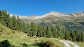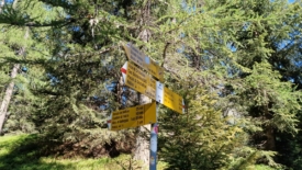 Quelques minutes ensuite suffisent à rejoindre la piste qui permet aux véhicules d’arriver à l’alpe Cristallina. Nous ignorons les sentiers qui coupent les virages, préférant le confort de la route, sa largeur nous permettant de marcher de front et sa faible déclivité de tenir une conversation sans être essoufflés. L’air se réchauffe maintenant que l’ombre de la forêt n’est plus là pour nous protéger.