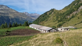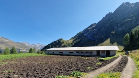 Après 3 km de piste, la présence du rumex s’intensifie. L’alpe Cristallina ne devrait plus être loin. Effectivement, au détour d’une courbe, apparaît une construction oblongue et basse, entourée de terre martelée par les sabots du bétail.