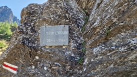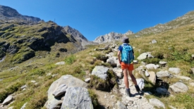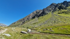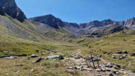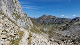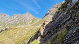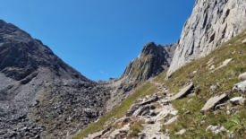 Le sentier passe au pied de falaises et au milieu de pierriers. Je regrette de ne pas avoir attaché nos casques au sac à dos. Un petit caillou se détachant quelques mètres plus haut peut faire des dégâts, quand bien même la probabilité s’avère faible.