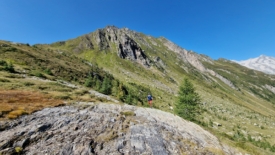 A quelques mètres du col, nous croisons un randonneur solitaire, puis, quelques minutes plus tard, alors que celui-ci a disparu, un gosse d’une douzaine d’années, tout seul, cavalant. Ne voyant personne le suivre, nous en concluons qu’il tente de rattraper l’adulte rencontré précédemment. Révoltant !