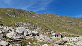 Effectivement, après avoir contourné une butte, nous apercevons le passo di Cristallina et perché, un petit rectangle noir que nous devinons être la cabane.