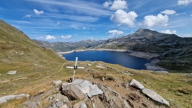 Une petite série de zigzags nous propulsent au col. Et là, les craintes de Stefano s’envolent. Depuis un moment, nous rigolions quant au fait que, depuis le col, le lago di Náret ne serait peut-être pas visible, rendant notre détour ici inutile. S’en suivrait, bien évidemment, une série de sévices, dont une assiette vide au dîner, ou, pire encore, contenant du pain moisi. Non, point de régime forcé, le lac est là, dominé par le pizzo del Lago Scuro. Il y a même une petite croix composée de deux bouts de bois blanchis accrochés ensemble par une sangle de sac à dos.
