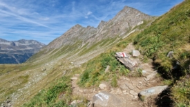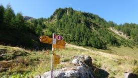 Après une courte montée entre un pâturage à droite et le ri di Cristallina à gauche, deux grandes traversées nous amènent à la première jonction où les indications de temps fournies par le panneau sont un peu contradictoires. D’après la carte, la capanna Cristallina est située sur le col éponyme. Avant 1999, elle était située bien avant le col, sur le plateau en contrebas et donc le temps nécessaire pour y accéder était inférieur à celui requis pour atteindre le col. D’où vient cette différence de 25 minutes ? Mystère et boule de gomme !