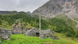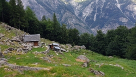 Quelques chalets y ont été construits, peut-être à l’origine même n’étaient-ce que des étables. Derrière cette montagne, le Glacier du Basòdino.