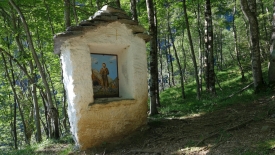 Après 30 minutes de montée, une chapelle appelle au repos. Le dessin, qui représente un moine franciscain, est délicieusement naïf.
