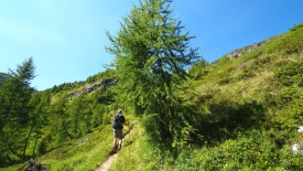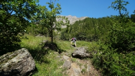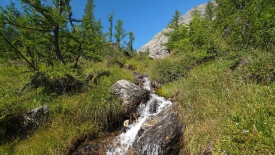 Nous pensons que le moment est venu de traverser le ri. Mais non, le sentier continue sur la droite du ruisseau, soutenu par les racines des mélèzes et contournant les rochers les plus imposants.