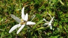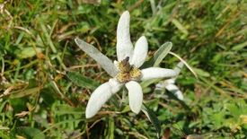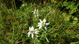 Nous avons à peine couvert quelques centaines de mètres que Stefano pointe une tache blanche, sur la droite, à un mètre du sentier. Des edelweiss. Quelle chance ! Trois autres spécimens, tout aussi jolis, sont également visibles, un peu plus loin. Six magnifiques exemplaires.