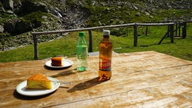 Nous nous asseyons, une bouteille de Rivella pour Stefano, un Sprite 100% sucre pour moi et deux belles parts de gâteau aux pommes.