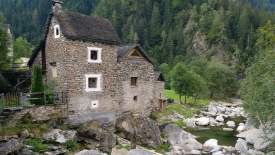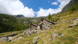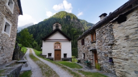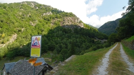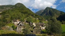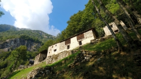 Nous laissons la voiture à Prato, dans le val Lavizzara, le long de la rivière Maggia. Prato est un village tristounet qui ne semble pas avoir été atteint par les subsides cantonales pour la rénovation de ses maisons, de ses églises ou des bâtiments administratifs. Certaines constructions sont dans un état de désaffection avancé, de grosses fissures zébrant les façades, les vitres des carreaux brisées ou fendues. Les maisons encore habitées ne font pas rêver. Les peintures des encadrement des fenêtres ou des portes, repeintes moult fois, s’écaillent. Nous avons tout le loisir de les contempler car le sentier traverse le village, pour se transformer par la suite en une route de terre battue qui mène au Monte di Predee, hameau autrefois habité à l’année.