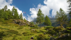 Nous sortons de la gorge et débouchons sur un pâturage. Trois drapeaux nous informent que sommes presque arrivés à la cabane.