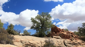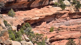 Mule Canyon semble être riche en sites des Ancestral Puebloans. De loin, nous apercevons, à quelques mètres d’intervalle des petits greniers et des habitations.