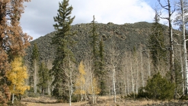 Les roches volcaniques, les sapins verts sombres, les trembles au feuillage jaune, quelques éclats de ciel bleu forment un tableau contrasté.
