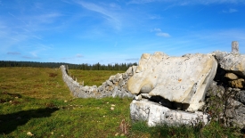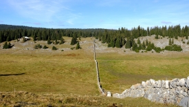 Le mur, qui coupe en deux la Combe des Amburnex. Le chalet, visible à gauche s’appelle la Cabane de l’Écureuil.