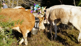 Des hommes, bâton à la main et chemises à carreaux courent pour tenter de les rassembler. Evidemment, c’est la désalpe ! Une dame vient vers nous, alors que nous sommes en train de nous chausser. Elle nous dit que les vaches laitières sont déjà descendues mais que là, ce sont les génisses. Et que comme chaque année elles descendent le dernier weekend d’octobre.