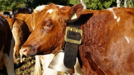 Nous nous garons sur le parking à du Sapin à Simeon. Un stand de ravitaillement y est dressé, entouré d’une quinzaine de personnes. Dans le pré adjacent, des vaches un peu agitées. En regardant de plus près, elles portent d’énormes sonnailles et certaines portent des coiffes.