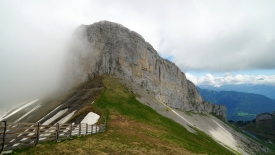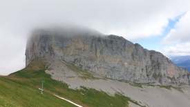 Une peu noyée dans les nuages. Un gros bloc de de roche calcaire, imposant, presque intimidant.
