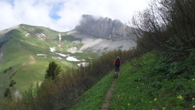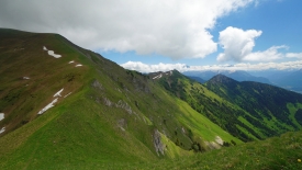 Que voit-on ici ? Au centre, ce petit téton abrite La Berneuse. Sur sa droite, le col du Liussel et le prochain pic est La Riondaz. La descente dont je parlais s’est faite dans la belle pente recouverte d’herbe. Puis, partant du coin inférieur gauche, la crête qui monte qui monte (comme la petite bête) pour arriver à la Chaux de Mont, hors cadre.