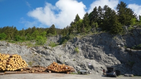 A cause d’une sortie d’autoroute fermée (pour cause de travaux, évidemment), nous arrivons à Aigle par des petites routes. S’ensuit une belle montée, délicieusement chaloupée et mon estomac est bien content lorsque nous arrivons au parking, situé à proximité d’une vieille carrière : la carrière des Chamois. Il faut imaginer un petit cirque d’une cinquantaine de mètre de diamètre, entouré de falaises d’une quinzaine de mètres de hauteur, toutes équipées pour l’escalade. Le sol est rough, entre cailloux et rochers. Deux tas imposants de tronc d’arbre limitent la capacité du parking.